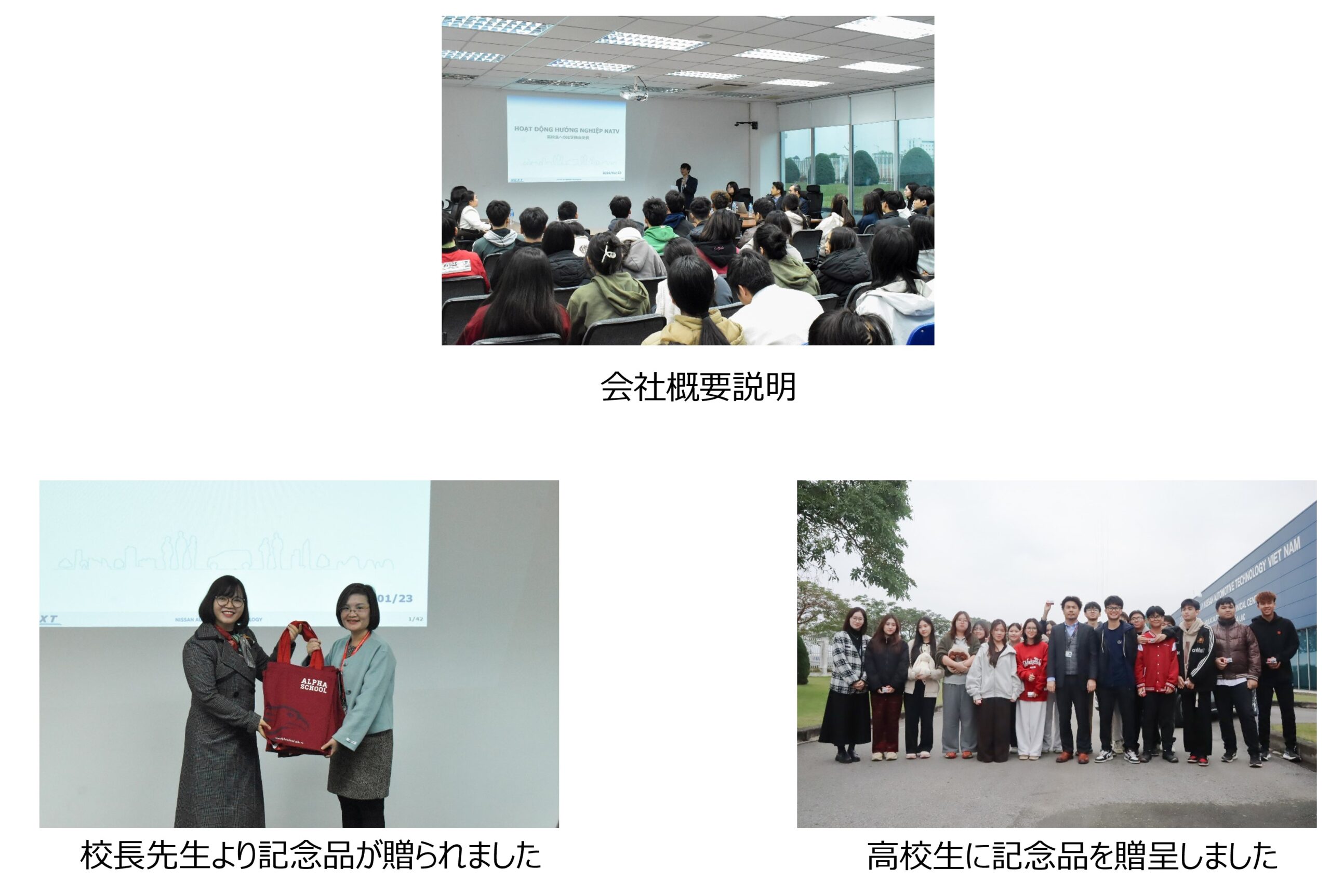 日産オートモーティブテクノロジーベトナムはベトナムの若い世代に、自動車・エンジニアリングの仕事に興味を持ってもらうことを目的として、FY14よりホアラックテクニカルセンター(HTC)において高校生への見学機会提供を隔年開催しています。また、自動車に関わる仕事への関心を持ってもらうことで、将来のキャリアを考えるきっかけになることも期待しています。